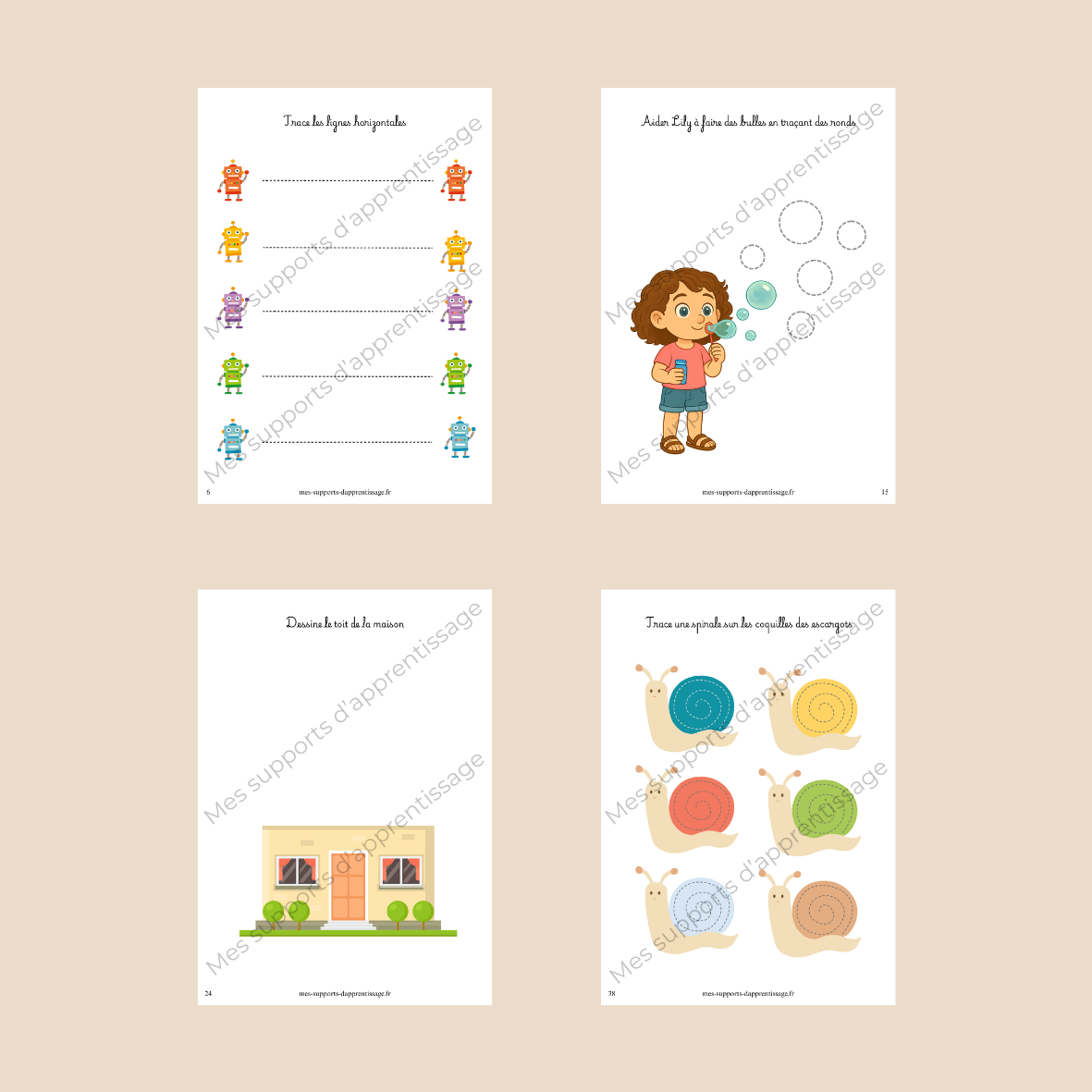 Ce livret de graphisme de 41 pages propose 31 activités autour des premiers gestes graphiques à maîtriser en maternelle. Il est conçu pour accompagner les enfants dès 3 ans dans l’exploration du graphisme de manière progressive et structurée.