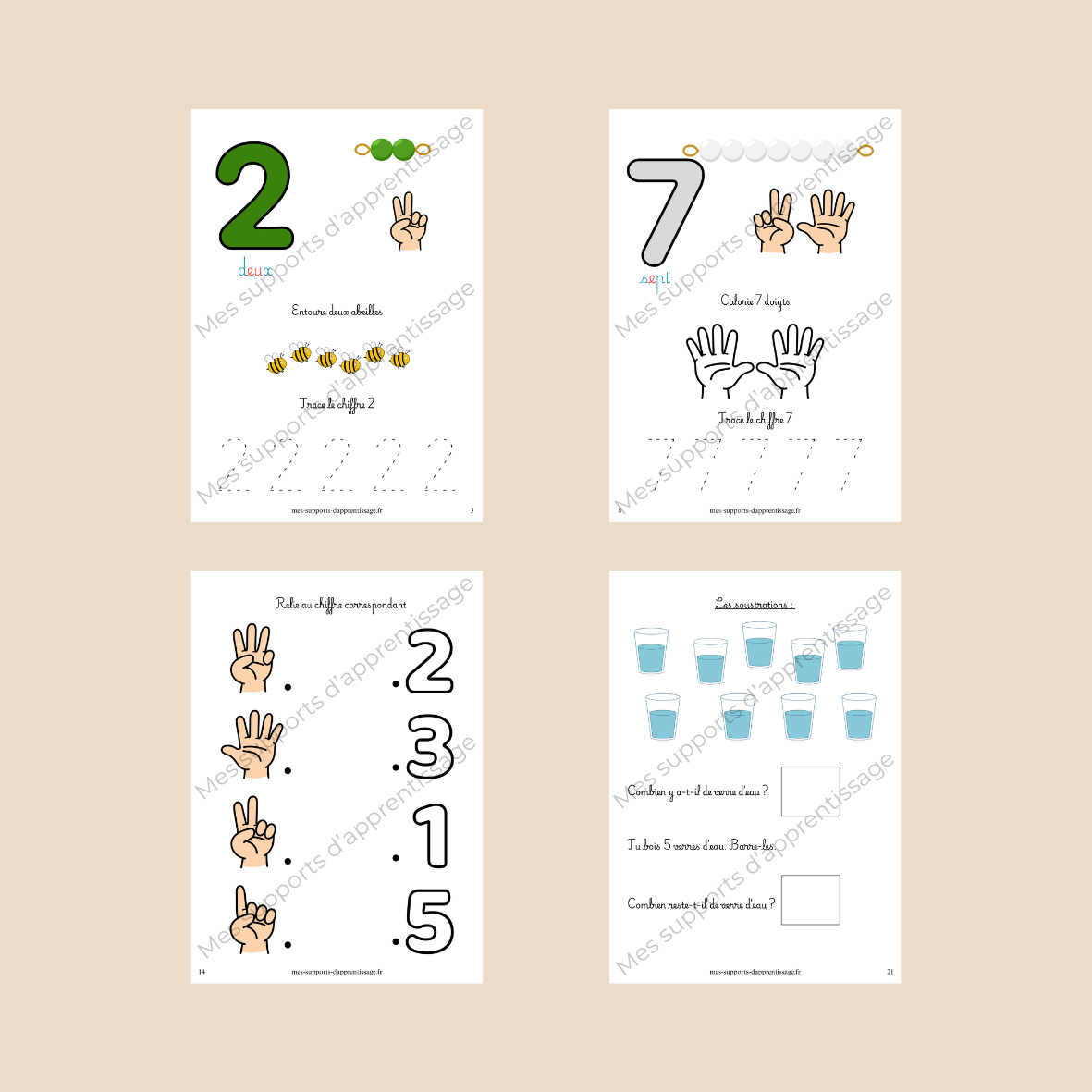Il contient 21 pages d’activités variées : 11 pages pour découvrir les chiffres de 0 à 10 et 10 pages pour s’exercer à les reconnaître, les associer à des quantités, dénombrer ou faire ses premiers calculs.
